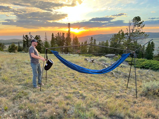 The idea for a lightweight portable hammock stand came to Cal on a hunting trip. Years of physical labor (and acting like he was invincible) working on ranches, building hundreds of miles of fences, welding, and bull-riding had caused painful joint flare-ups in his back. Sleeping on hard ground was getting more difficult, so he took a hammock along on his trip. He had never slept better outside, and became determined to invent a lightweight stand that he could carry anywhere.