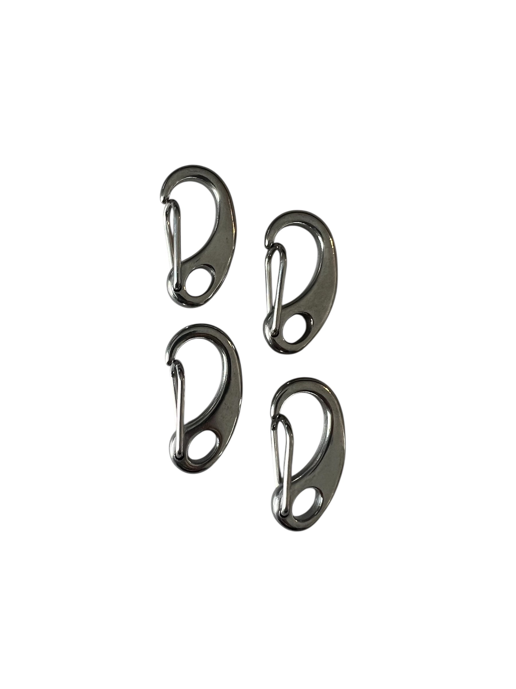 These mini stainless steel carabiners are an easy way to attach anything. Tarp lines, guy-outs, adjusters, etc. Just clip in place instead of tying a knot.