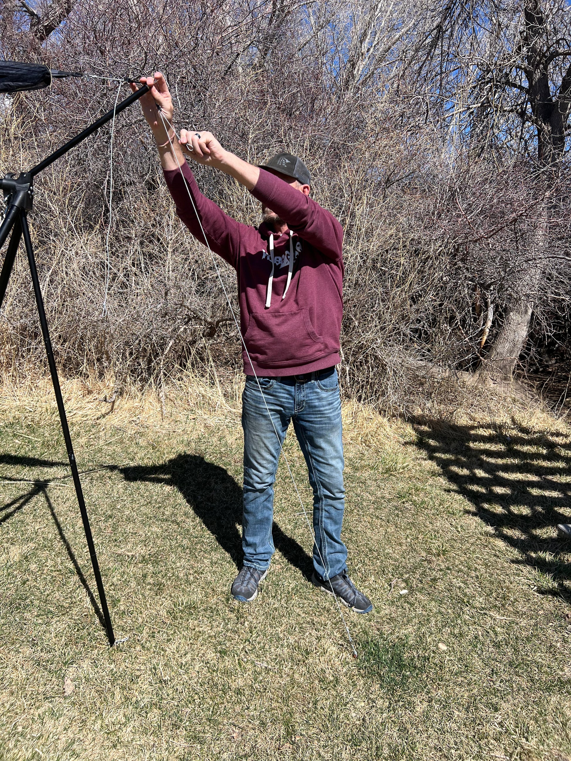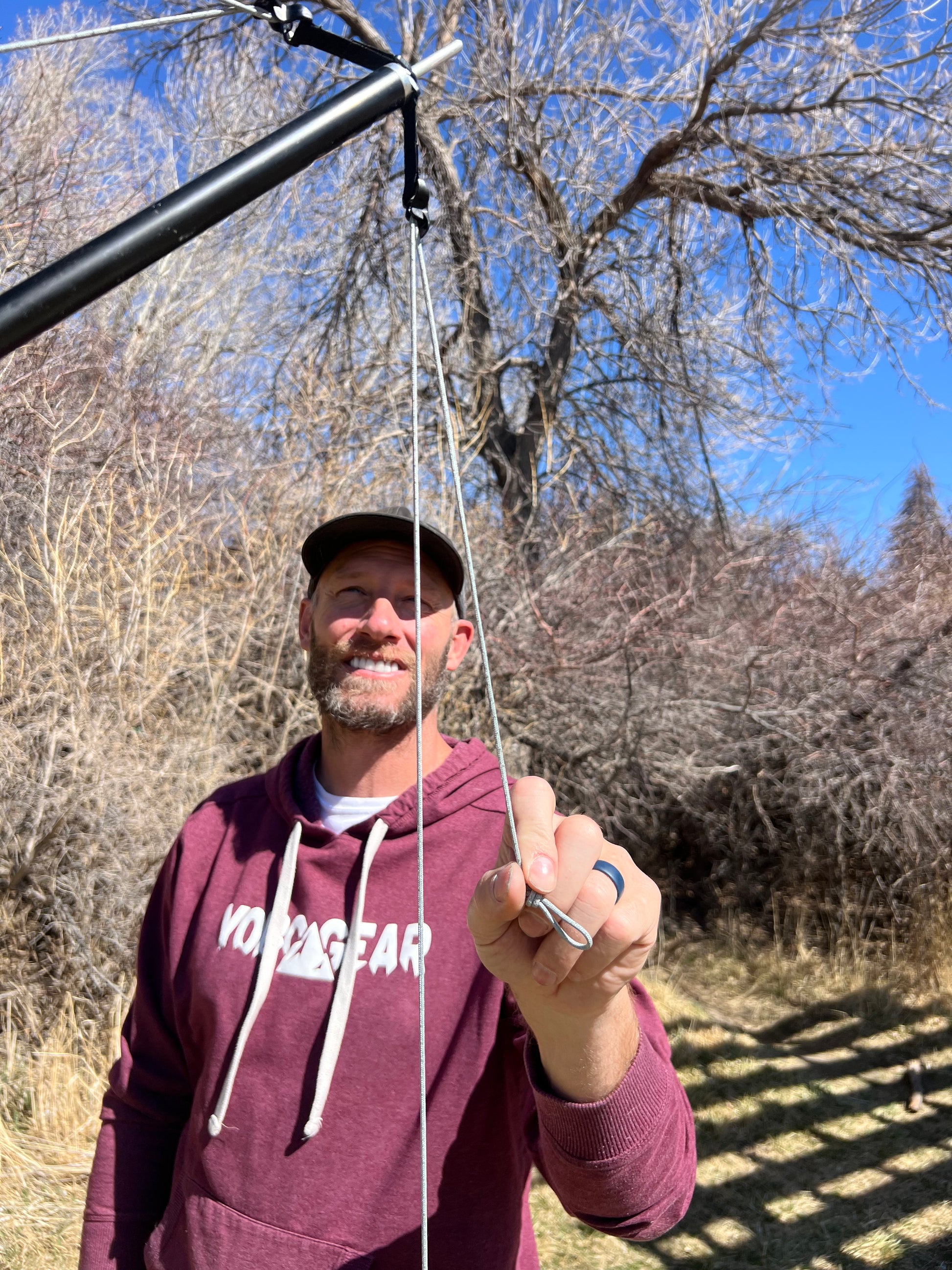 Attach the D-ring to the tarp extension pole on your hammock stand, then attach the other end to either a stake in the ground or to the stabilizer pole of your Turtlebug stand.